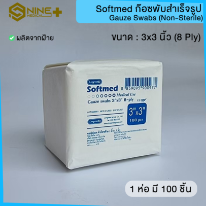 Softmed ก๊อซพับ ผ้าก๊อซปิดแผล ผ้าก๊อซฝ้ายแท้ (Gauze Swab) ขนาด 3×3 นิ้ว/ 8 PLY 100 ชิ้น ยี่ห้อ Longmed